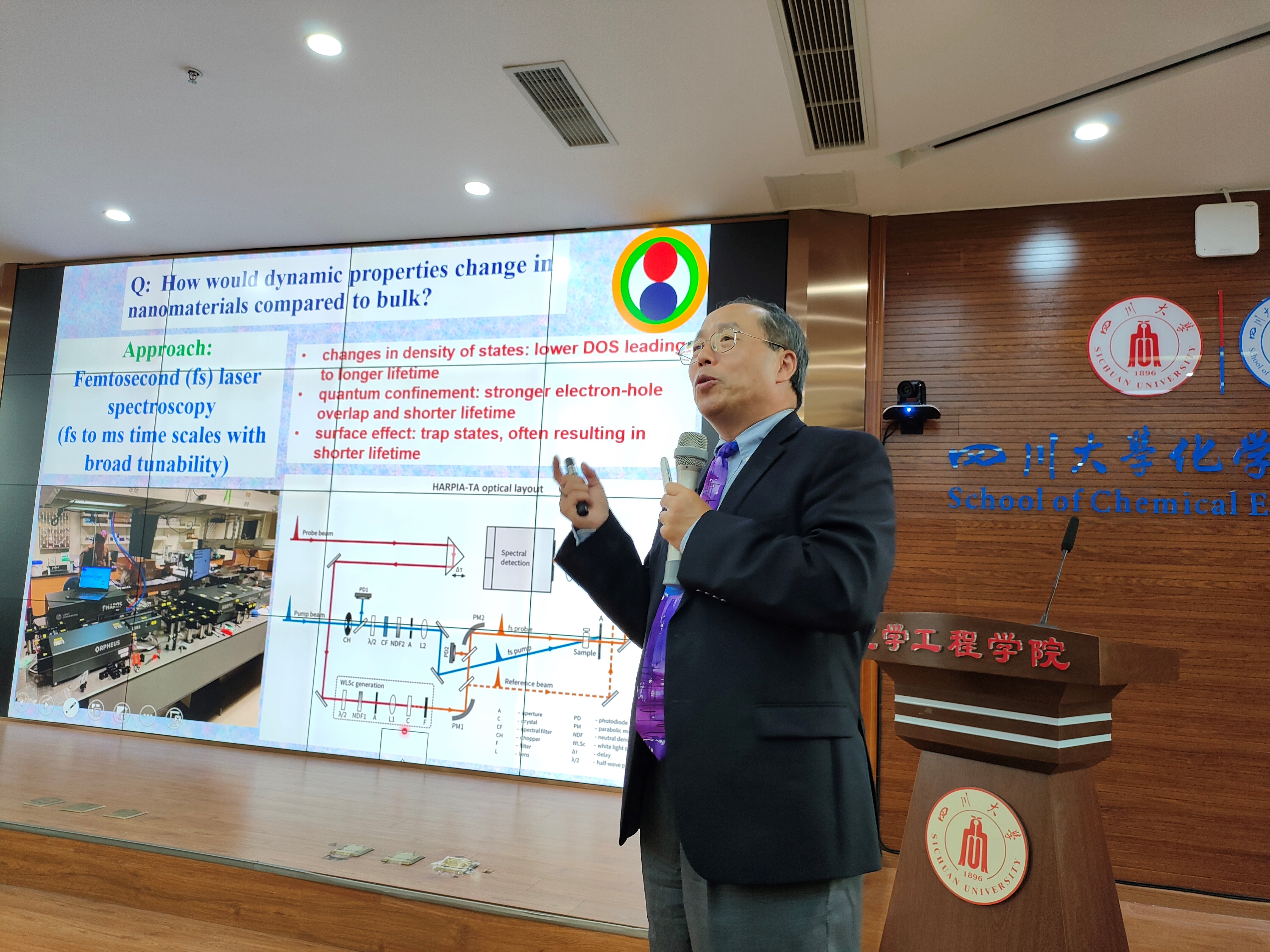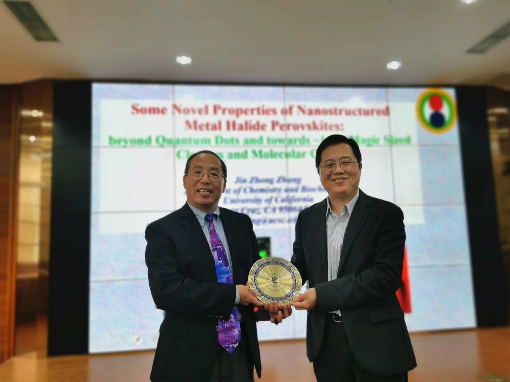 2023年10月24日上午9:00,加州大學(xué)圣克魯斯分校杰出教授、Journal of Physical Chemistry Letters行政編輯和ACS Physical Chemistry Au高級(jí)編輯張金中先生應(yīng)邀做客化工學(xué)術(shù)大講堂系列講座,并在beat365313報(bào)告廳作了“Some Novel Properties of Nanostructured Metal Halide Perovskites: beyond Quantum Dots and towards ~1 nm Magic Sized Clusters and Molecular Clusters”為題的精彩學(xué)術(shù)報(bào)告。本次講座特邀我校余睽教授出席,余教授也帶來(lái)了“Introduction to the Nobel Prize in Chemistry 2023”的精彩報(bào)告。此次講座由beat365王貴欣教授主持,來(lái)自beat365、材料學(xué)院、物理學(xué)院、華西醫(yī)院等相關(guān)學(xué)院師生聆聽(tīng)了本次學(xué)術(shù)報(bào)告。