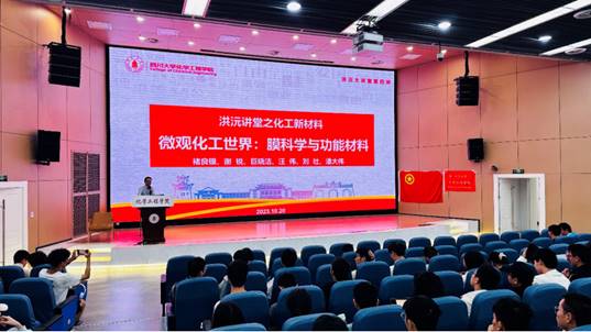 2023年10月20日14:00,beat3652023級(jí)全體本科生匯聚于四川大學(xué)江安校區(qū)水上報(bào)告廳,參加了洪沅講堂第四講“微觀化工世界:膜科學(xué)與功能材料”的交流講座。參加本次講座的嘉賓有beat365汪偉教授、劉壯教授以及潘大偉特聘副研究員,該講座由汪偉老師主講,beat3652023級(jí)黃楊煦飛同學(xué)主持。