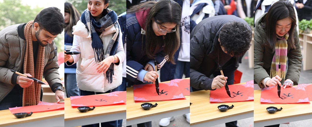 剪紙結(jié)束之后,同學(xué)們開始揮灑墨水,在紅紙上寫起了新春祝福,一個(gè)個(gè)“?!?、“過”、“發(fā)”和“和”字分別代表了同學(xué)們?cè)谛履昀锏拿篮米T?。留學(xué)生們也努力學(xué)習(xí)起來,一筆一畫勾勒出“福”字。最后,留學(xué)生、港澳臺(tái)學(xué)生和其他學(xué)生以及老師們一同寫下了“和”字。