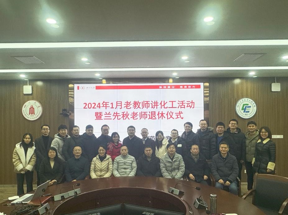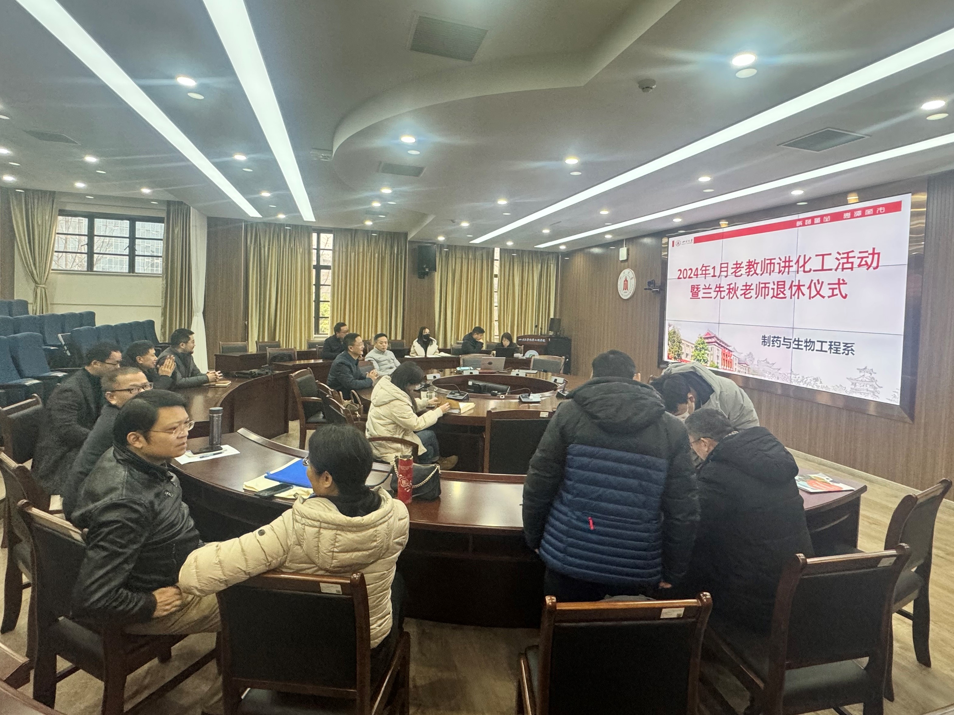2024年1月5日上午,制藥與生物工程系黨支部和系工會小組在望江校區(qū)化工樓312會議室,聯(lián)合開展了“老教師講化工”活動暨蘭先秋老師榮休儀式。系支部書記謝通慧主持活動。系退休教師何澤超老師、蘭先秋老師,學(xué)院黨委副書記兼紀(jì)委書記李德富,以及全系在職教師參加了此次活動。