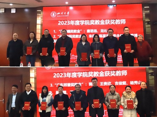 鐘本和杰出教授、李軍教授和學院領導一起向獲得2023年度學院圣華曦獎教金、宜化獎教金、邦普獎教金、云圖獎教金的16位教師頒發(fā)了榮譽證書。