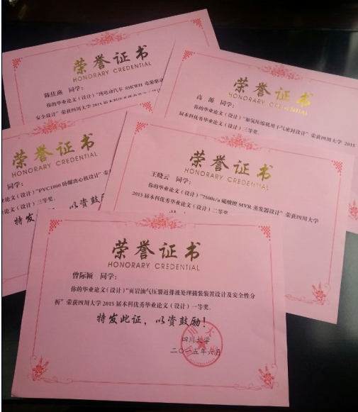 褚良銀教授指導劉露月同學完成的《基于仿生材料的溫敏表面的制備與性能研究》、黃衛(wèi)星教授指導潘大偉同學完成的《核電廢水TEP系統(tǒng)脫氣塔填料流體力學性能研究與傳質計算》、宋航教授指導劉維燥同學完成的《新型托品醇類離子液體的合成、表征及其在Dl-苯丙氨酸拆分中的應用》、肖澤儀教授指導曾際穎同學完成的《頁巖油氣壓裂返排液處理撬裝裝置設計及安全性分析》榮獲了本屆四川大學本科優(yōu)秀畢業(yè)論文一等獎。